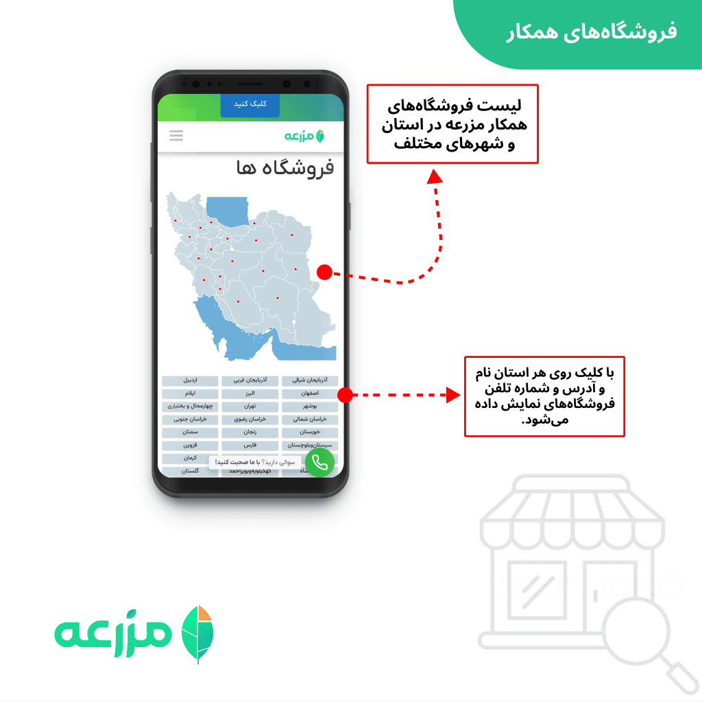 • فروشگاههای همکار: امکان خرید از فروشگاه‌های همکار سامانه‌ی مزرعه در تمامی شهرها